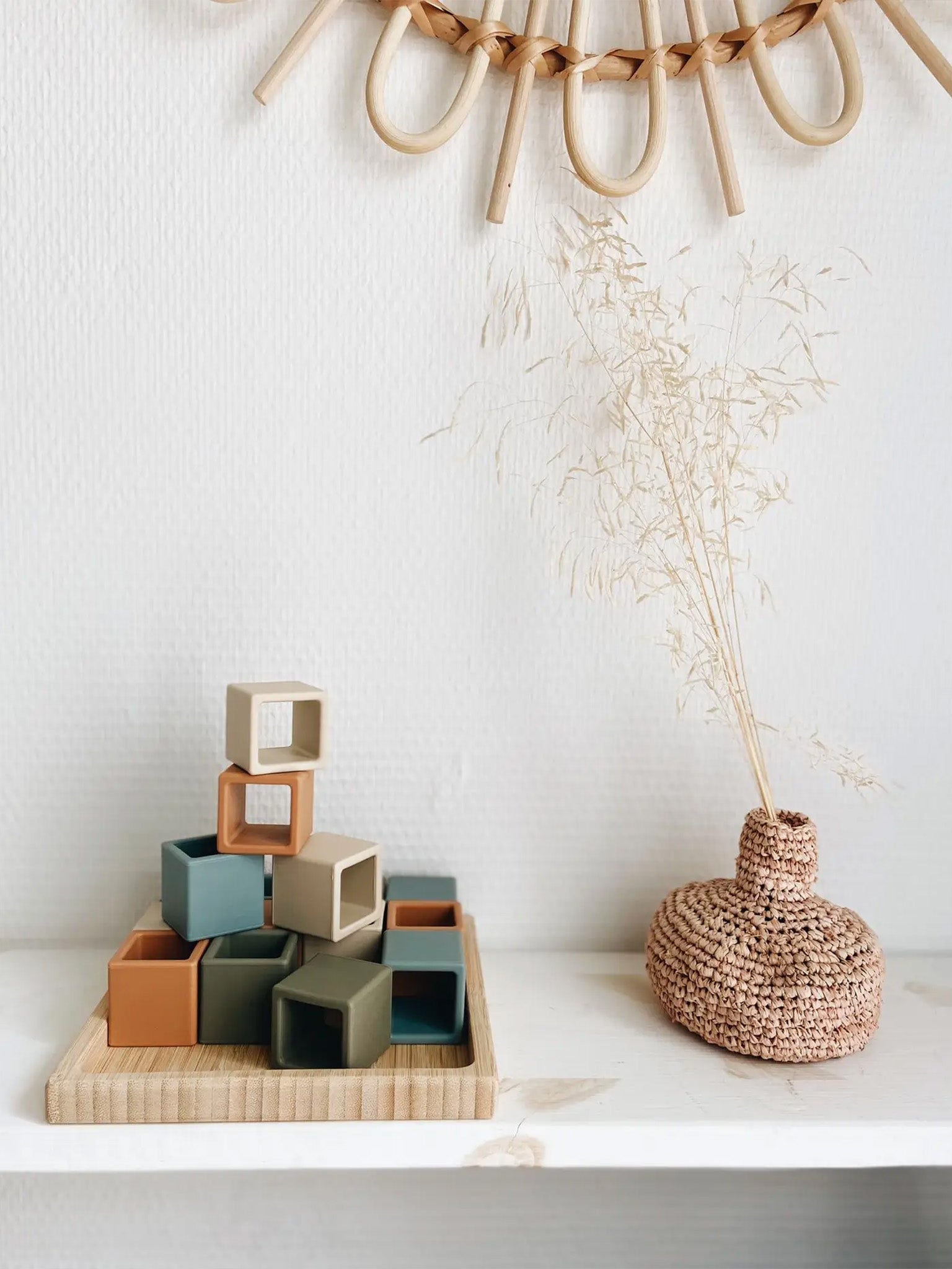 The cube puzzle allows your little one to stack, sort, and balance. This game consists of 16 blocks in four different colors and a wooden plate