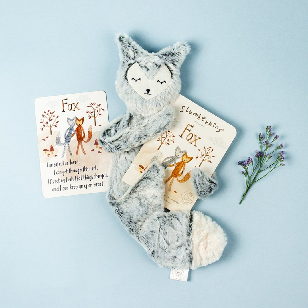 Fox supports our Family Change collection. Big changes can be difficult for our little ones to navigate; our Fox Snuggler and story helps support them through these transitions. Fox's board book assists children in understanding and accepting change and reminds them they are safe and loved. This product includes: