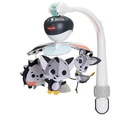 Point out to the smiling characters hanging on the mobile to start building baby’s vocabulary: “Where is the Christopher the Fox? Here he is! Where is Marie the Hedgehog? There she is!”